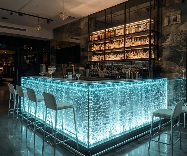 Kính đem đến sự trong suốt, nhẹ nhàng và hiệu ứng ánh sáng tuyệt vời. Quầy bar kính thường được làm từ kính cường lực dày, có khả năng chịu lực, chịu va đập cao, đảm bảo an toàn trong quá trình sử dụng. Khi kết hợp với hệ thống đèn LED, quầy bar kính trở thành tâm điểm thu hút nhờ hiệu ứng lung linh, hiện đại và vô cùng độc đáo.