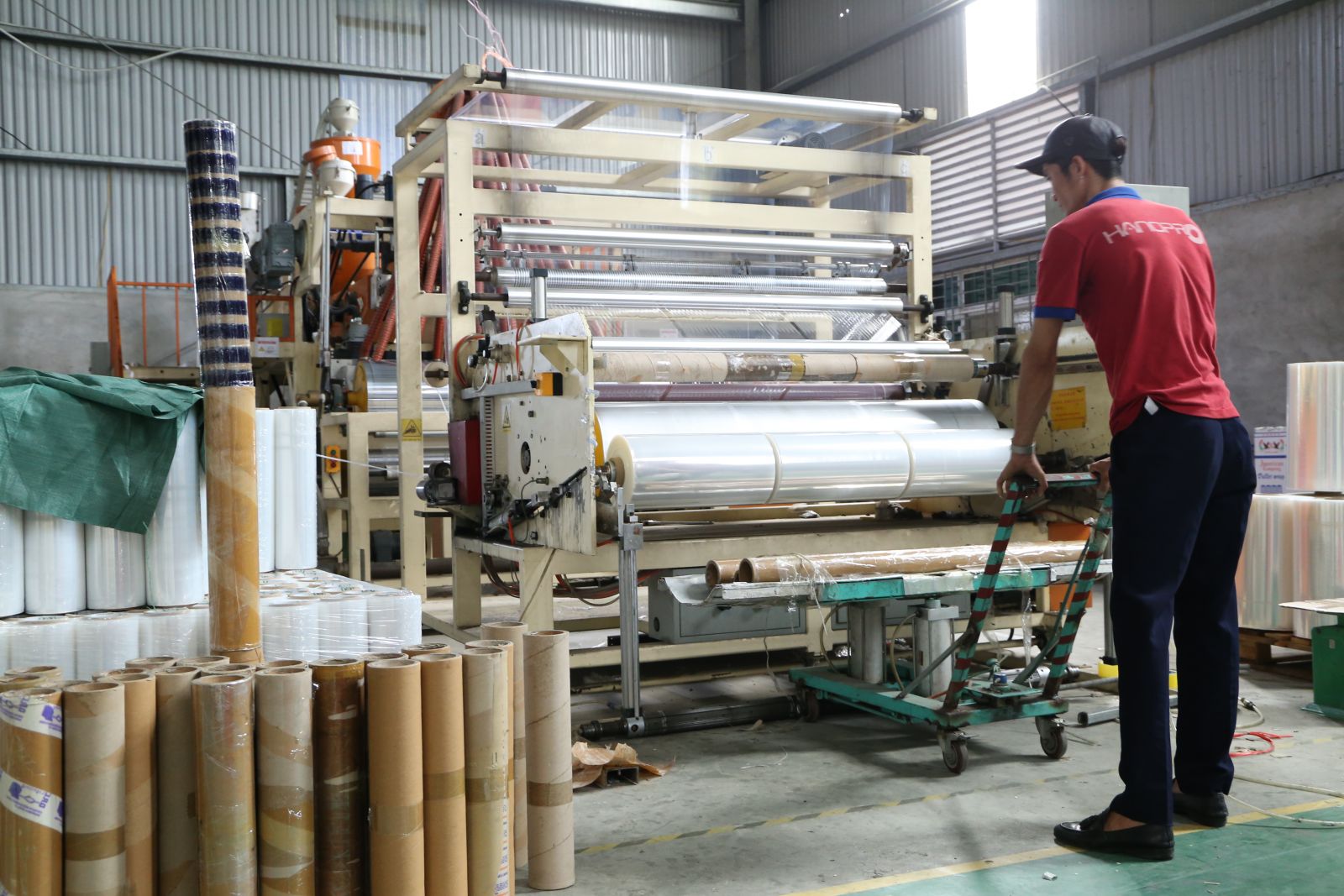 Màng sau khi đạt chuẩn sẽ được dẫn qua hệ thống trục lăn và cuộn vào lõi giấy hoặc lõi nhựa. Khi đạt đến chiều dài hoặc trọng lượng quy định, hệ thống sẽ tự động cắt và chuyển sang cuộn mới.